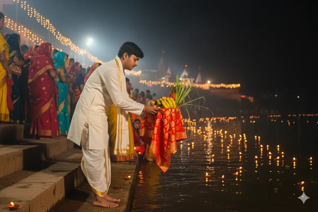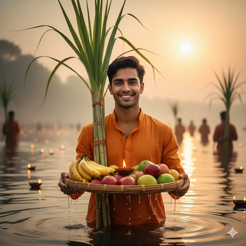 "A naturalistic and vibrant portrait of a young man, possibly in his early 20s, standing waist-deep in the water of a sacred river (like the Ganges). He is participating in the Chhath Puja festival. The man has a warm smile and is wearing a traditional saffron or bright orange kurta. He is holding a large, round bamboo basket (soop) brimming with fresh fruits such as bananas, apples, pomegranates, and mangoes, along with other puja items including a lit clay lamp (diya) and long sugarcane stalks."