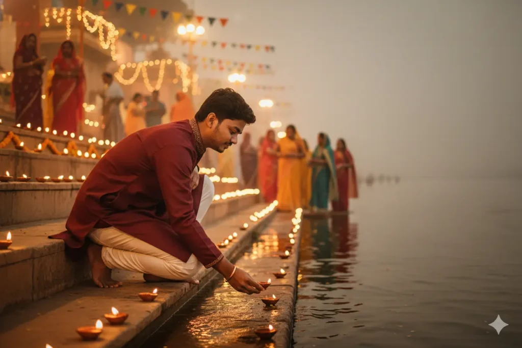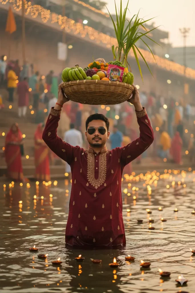 "Photorealistic cinematic portrait of a young South Asian man standing waist-deep in a river during a traditional Hindu festival at dusk. He wears a maroon embroidered kurta and stylish sunglasses, holding a large wicker basket filled with fruits, bananas, sugarcane, and offerings above his head. Dozens of glowing diyas (oil lamps) float on the water, casting warm golden reflections. The background shows a softly blurred crowd dressed in colorful sarees and traditional attire, gathered near stone ghats illuminated by festive lights and misty evening air. The atmosphere is spiritual, serene, and vibrant — evoking devotion, culture, and celebration. 8K ultra-detailed, cinematic lighting, shallow depth of field, natural colors, bokeh background, HDR realism."