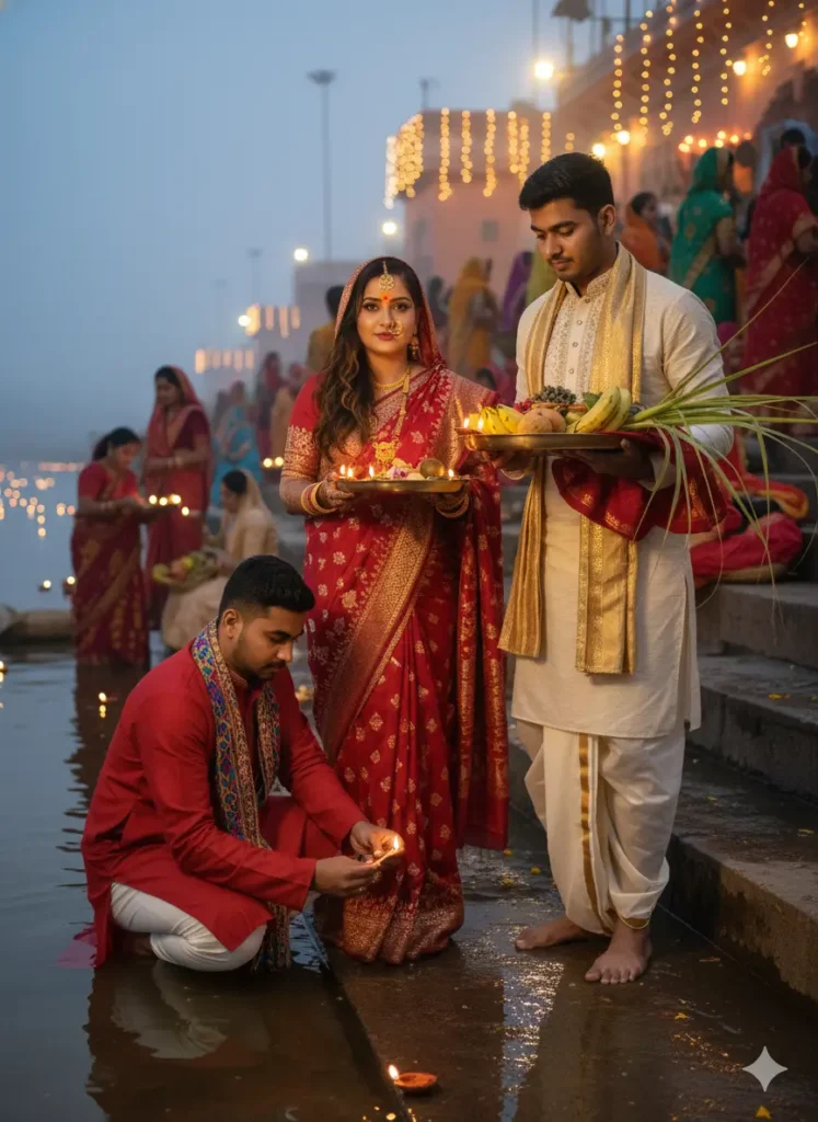 "A hyperrealistic cinematic portrait of an Indian couple performing Chhath Puja together on the river ghat during sunrise, with a full crowd of people in the background. The woman is wearing a traditional red and yellow silk saree with sindoor and glass bangles, holding a bamboo soop filled with fruits, sugarcane, and diya. The man is standing is standing beside her wearing a luxurious light sky blue kurta, intricate gold embroidery around the collar and cuffs, and a white cream color pajama with a maroon shawl, holding a brass lota of Ganga jal. The colorful ghat is decorated with diyas and marigold flowers, with offerings to the Sun God, creating a peaceful spiritual atmosphere and holy vibes. Gentle golden light reflects on the water, highlighting the traditional cultural festival, ultra detailed, 8K. Use same to same face as given reference pic."