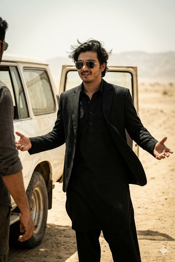 Create a highly realistic, cinematic image of a 17-year-old young man who appears to be an actor, with dark, windswept hair and stylish gold-framed aviator sunglasses. He is dressed entirely in black, wearing a black Pathani suit paired with a black blazer, giving off a sharp, suave, and slightly villainous persona. The young man has a subtle smile or smirk on his face, and his arms are outstretched with palms slightly open, as if he is presenting something, shrugging, or expressing calm confidence or mild exasperation. He appears to be mid-conversation with someone partially visible on the left side of the frame, where only an arm and shoulder can be seen. The scene is set in a vast, open, desolate landscape resembling a dusty sandy plain or desert, with hazy light-brown or tan sand and faint hills in the distance, indicating a dry, arid environment. To the man’s left, a portion of a vintage or older white vehicle—possibly an SUV or truck—is visible with the rear passenger door open, adding to the sense of an action or drama sequence. The overall style should be cinematic, like a high-definition film still, with dramatic lighting despite the bright environment, capturing an intense action-thriller mood. The face must match the reference image with 100% accuracy.