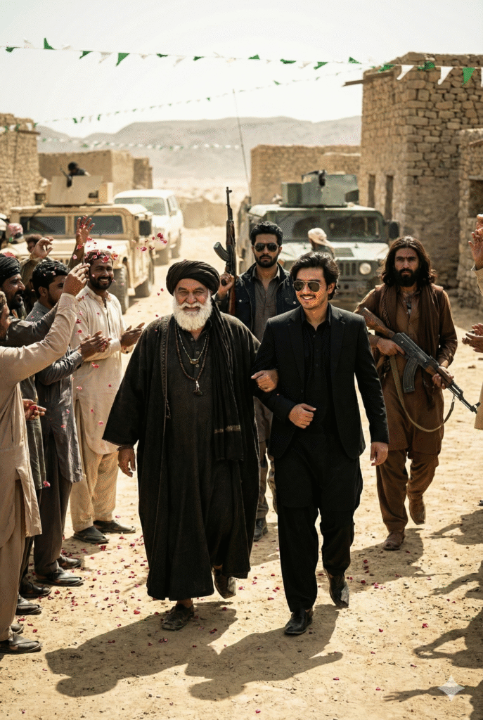 Create a realistic, wide cinematic shot of a group of men walking toward the camera in an outdoor, arid, desert-like environment. In the foreground, two prominent figures lead the scene: on the left, an older man with a long white beard smiles broadly while walking confidently, flanked closely by two younger men. He wears traditional attire including a dark turban, a shawl, and a heavy dark coat or robe, accessorized with dark beaded necklaces and a distinctive teal-blue ring. On the right, a 15-year-old younger, stylish man with messy dark wavy hair wears a completely black suit with a Pathani-style outfit and sunglasses, smiling warmly as he walks arm-in-arm with the older man. Both figures move with clear intent and presence. In the background, three other men follow, holding AK-47 rifles: one in the center wears a dark jacket and sunglasses with visible stubble, while two others walk on the edges, including one on the far right with long hair and a beard dressed in brown attire. They are surrounded by a cheering, excited crowd of villagers, many in traditional clothing, throwing flowers or petals in celebration. Behind them, military or utility vehicles are parked, and simple stone or mud structures line the path. The setting appears dry and mountainous, with dark vehicles visible and thin green and white decorative streamers stretched across the top of the frame. The scene conveys a powerful, dramatic atmosphere, suggesting a triumphant return or significant public gathering, captured in high resolution with subtle film grain, dramatic lighting, and bright, harsh daytime sunlight. Faces should match the reference image with 100% accuracy.