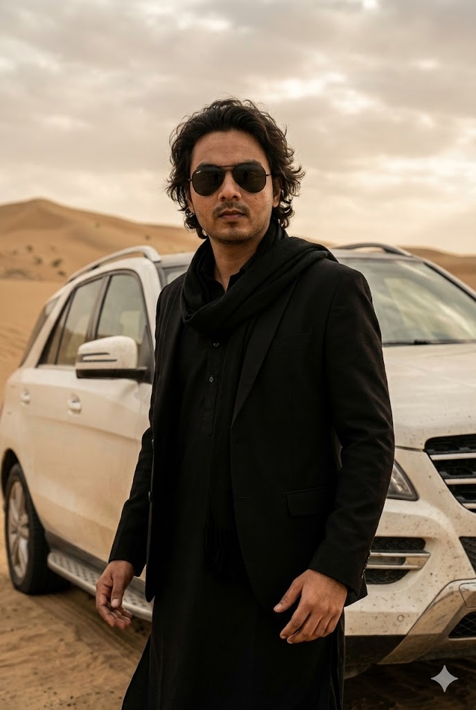 A stylish Indian man standing confidently in a desert landscape, wearing a black kurta with a black blazer and matching scarf, dark aviator sunglasses, medium wavy hair, calm and powerful expression. Hands slightly open in a relaxed yet dominant pose. A luxury white SUV parked behind him at an angle. Dusty environment with soft sand dunes in the background. Cloudy sky with muted beige and warm tones. Cinematic Bollywood movie scene inspired by a serious action-drama character.