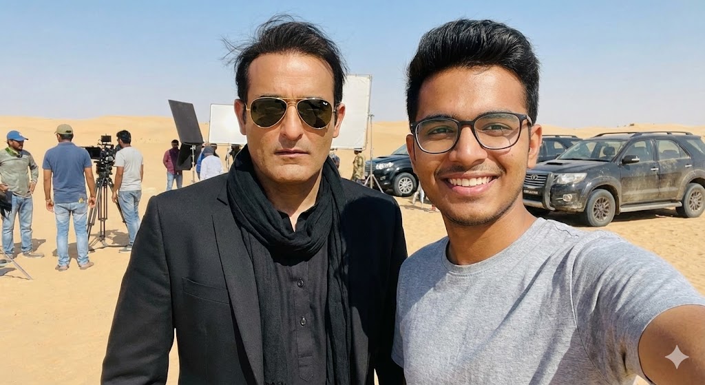 A realistic selfie shot taken by a young man standing next to Bollywood actor Akshaye Khanna in a desert environment. Akshaye Khanna is on the left, looking serious, wearing a black blazer over a black kurta, a black scarf wrapped around his neck, and gold-rimmed aviator sunglasses. He has slightly messy, windblown dark hair. The young man on the right is wearing a grey t-shirt and glasses, smiling at the camera. The background is a behind-the-scenes movie set in a sandy desert, with film crew members, technical equipment, lights, and black SUVs parked in the distance. Bright natural daylight, harsh shadows, 4k resolution, candid smartphone photography style.