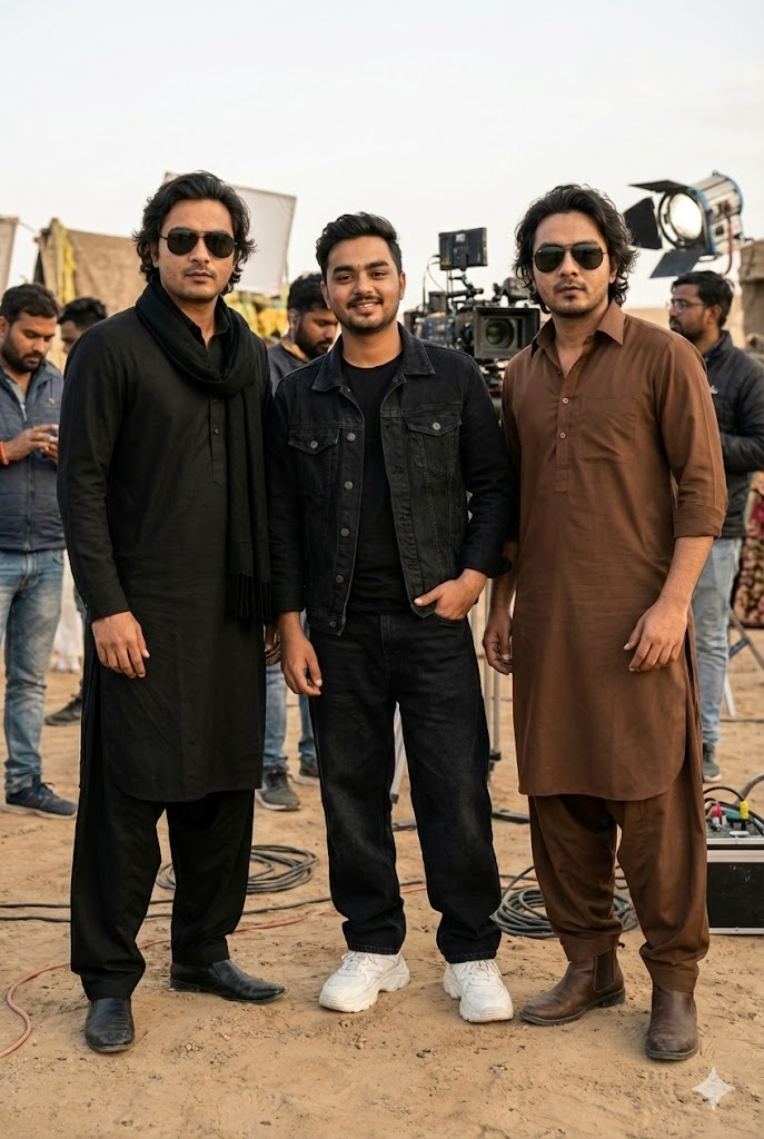 Hyper-realistic 8K natural photography showing a real behind-the-scenes film shoot moment from the movie “Dhurandhar”, captured at an outdoor location in daylight with natural cinematic lighting, realistic shadows, and a shallow depth of field. Three people are standing together naturally in a relaxed composition. In the center is me, with my face matching the reference image exactly, wearing a black denim jacket over a black t-shirt, black baggy jeans, and chunky white sneakers, with a slight smile and a calm, natural pose. On the left stands Actor 1, with his face and hairstyle matching the reference image exactly, dressed in a black kurta, black pajama, black stole/scarf, and a black outer layer, wearing black rectangular sunglasses. On the right stands Actor 2, with his face matching the reference image exactly, featuring the same long hairstyle and beard as the reference, wearing a brown traditional kurta with a brown salwar, brown boots, and black aviator sunglasses. All faces must match their respective reference images perfectly, and all outfits, hairstyles, accessories, and sunglasses must be exactly the same as shown in the references, maintaining a realistic, candid, cinematic atmosphere.